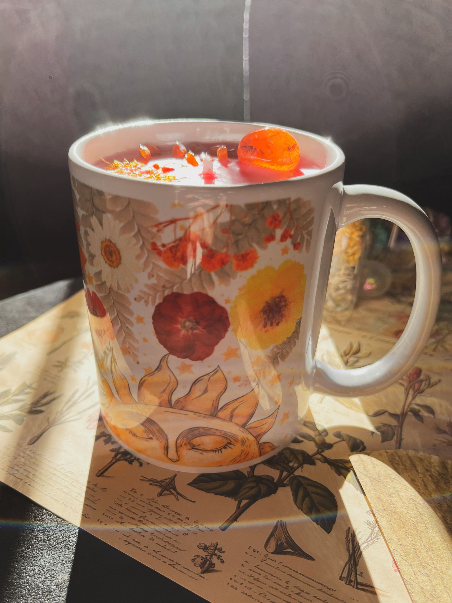 Su aroma combina el coco, dulce y envolvente, el jazmín, delicado y romántico, y el ámbar, cálido y reconfortante, creando un espacio que invita a la relajación y al disfrute de los pequeños instantes. Decorada con carneola y caléndula, esta vela conecta con la alegría, la creatividad y la energía femenina que nos hace brillar con naturalidad.