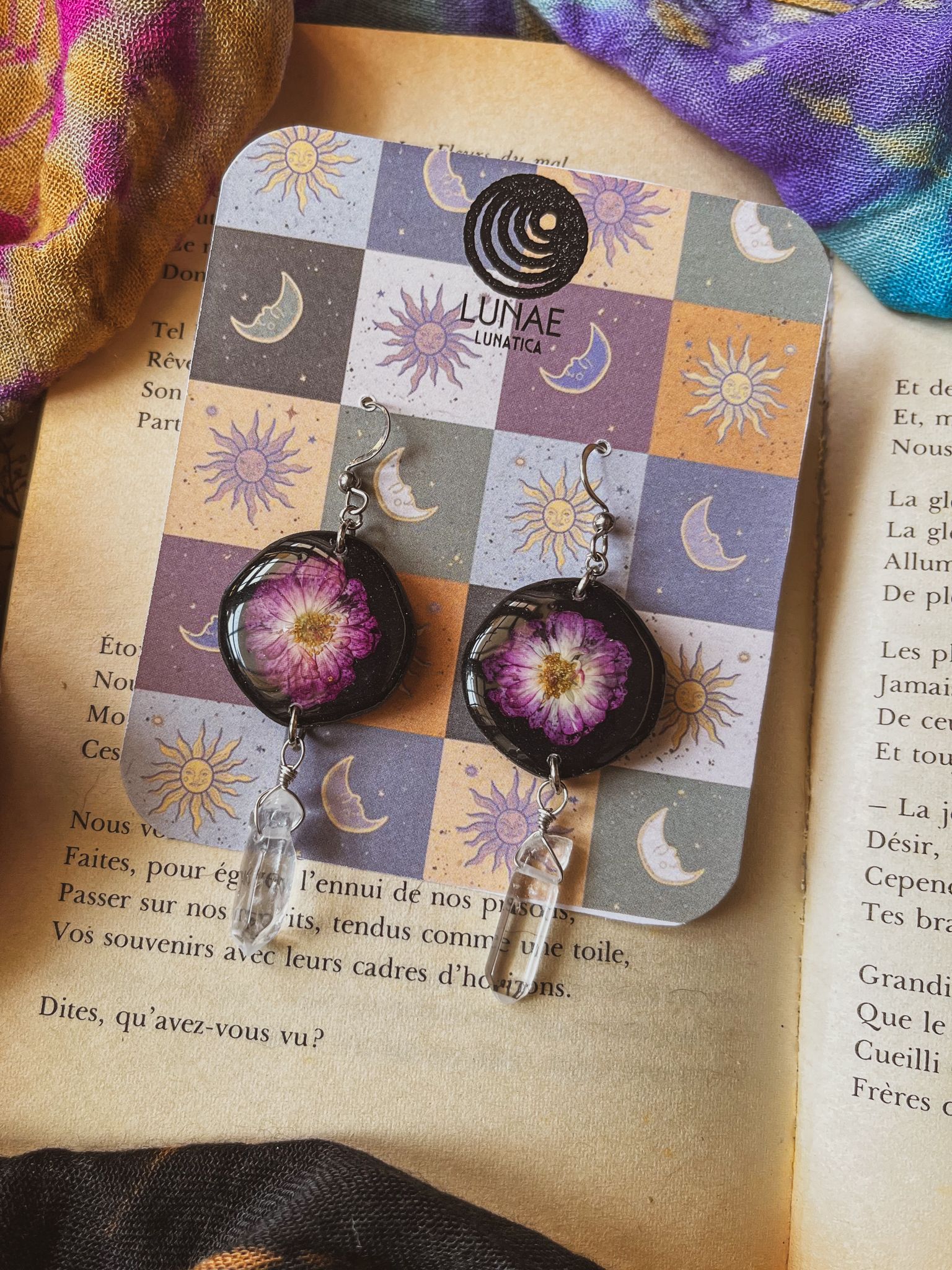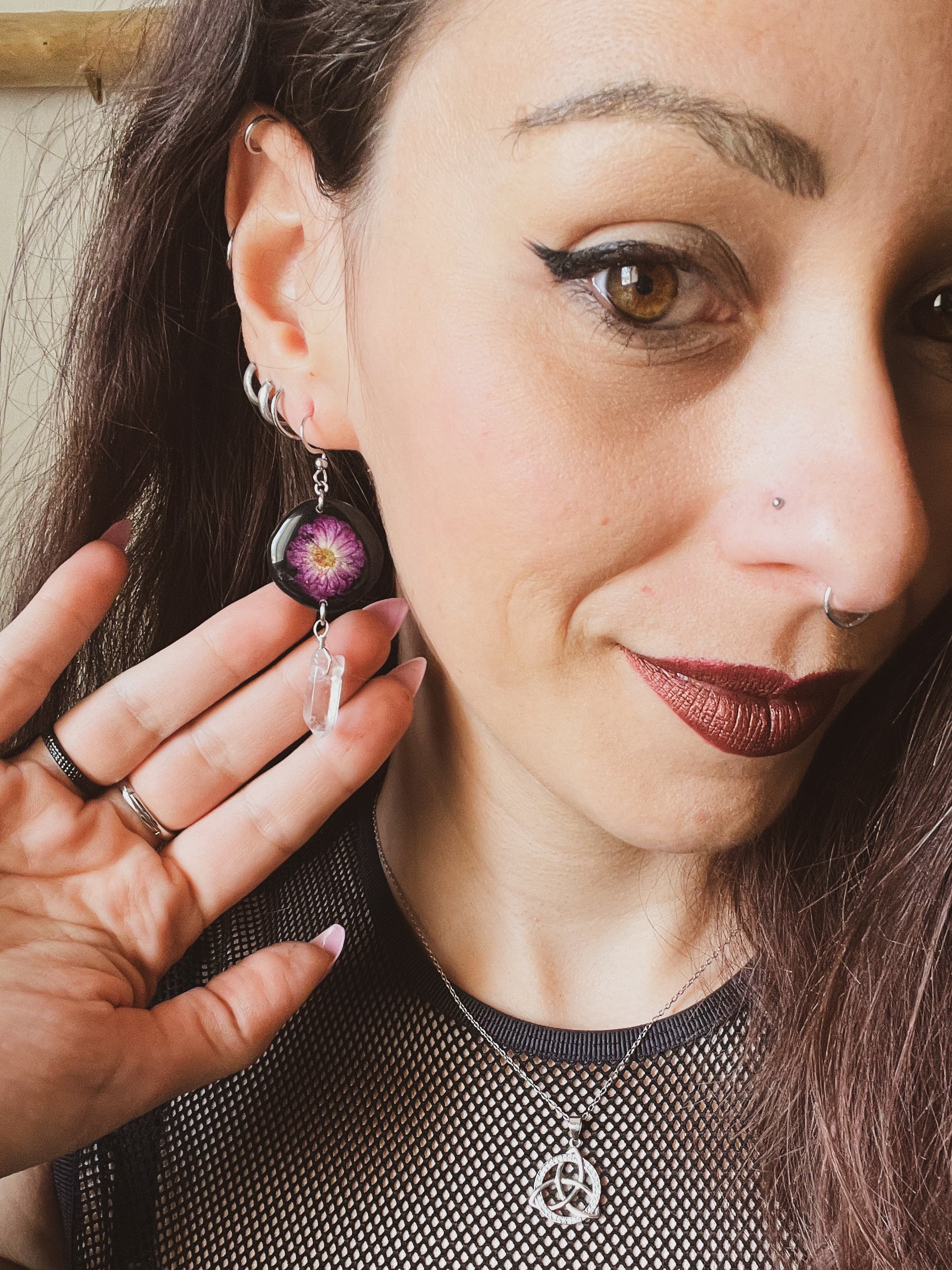 Pendientes de arcilla polimérica, cuarzo blanco y flores preservadas hechos a mano con amor y mucha magia para sentirte como la Diosa que eres!