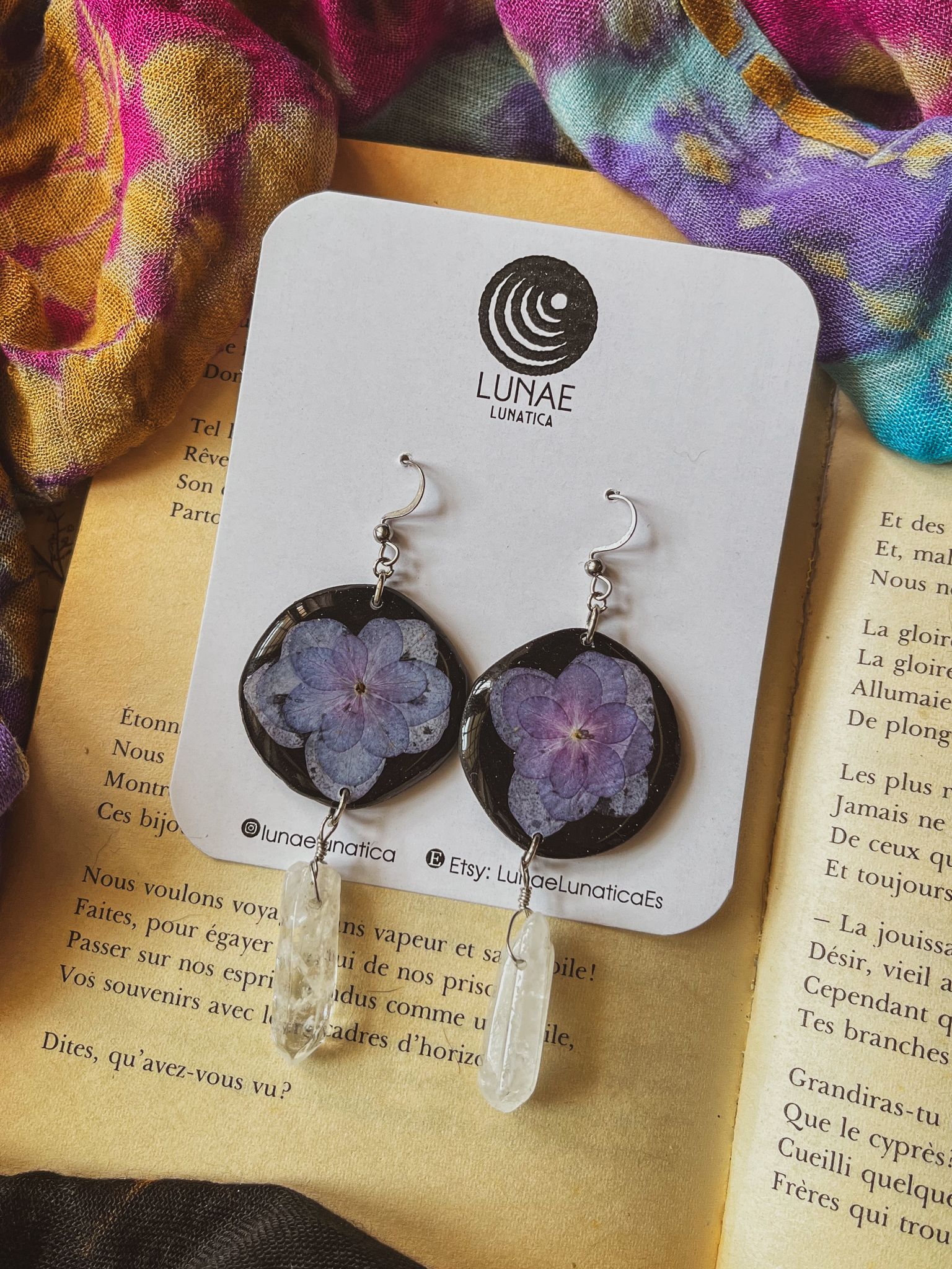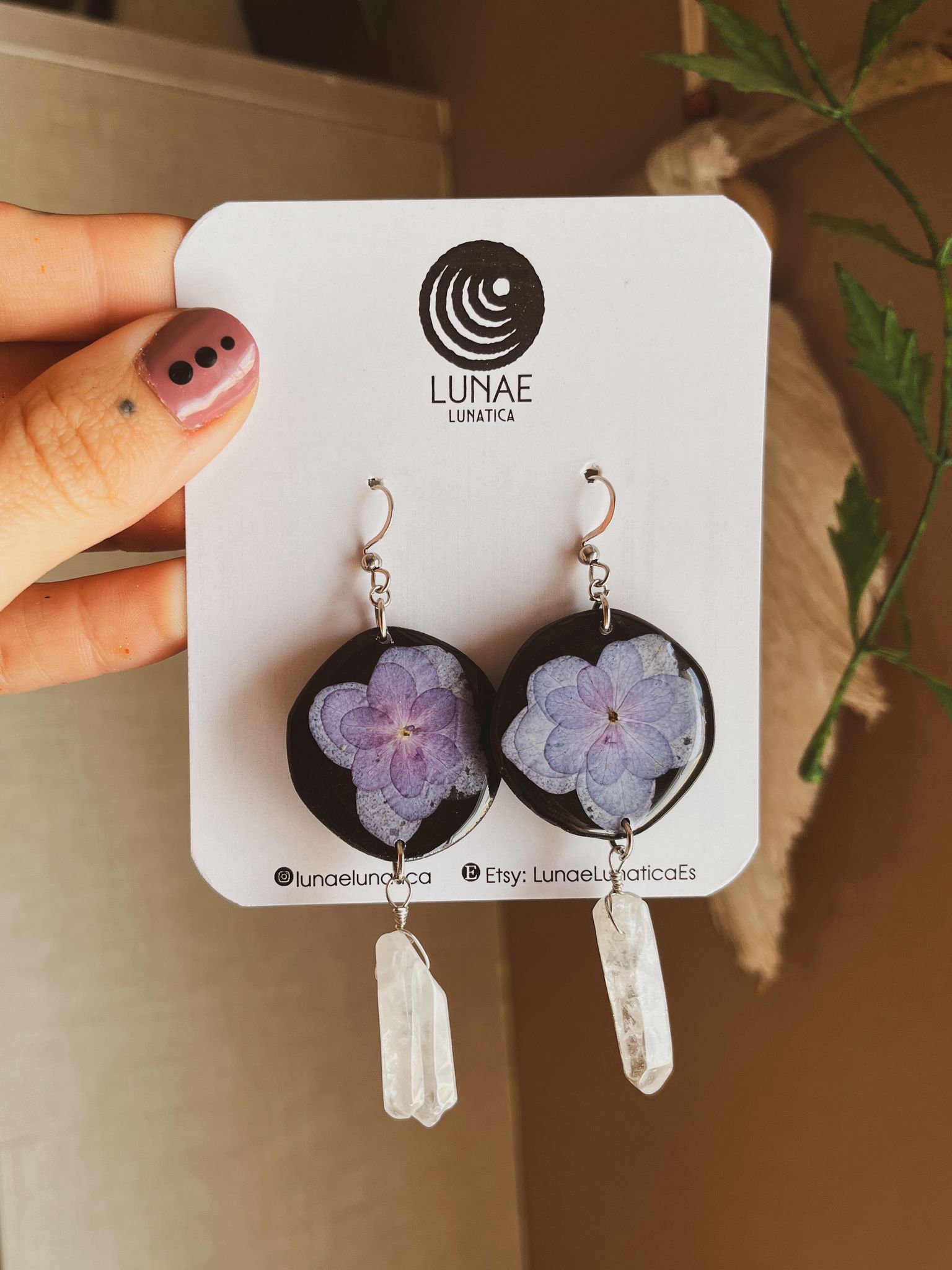 Pendientes de arcilla polimérica, cuarzo blanco y flores preservadas hechos a mano con amor y mucha magia para sentirte como la Diosa que eres!