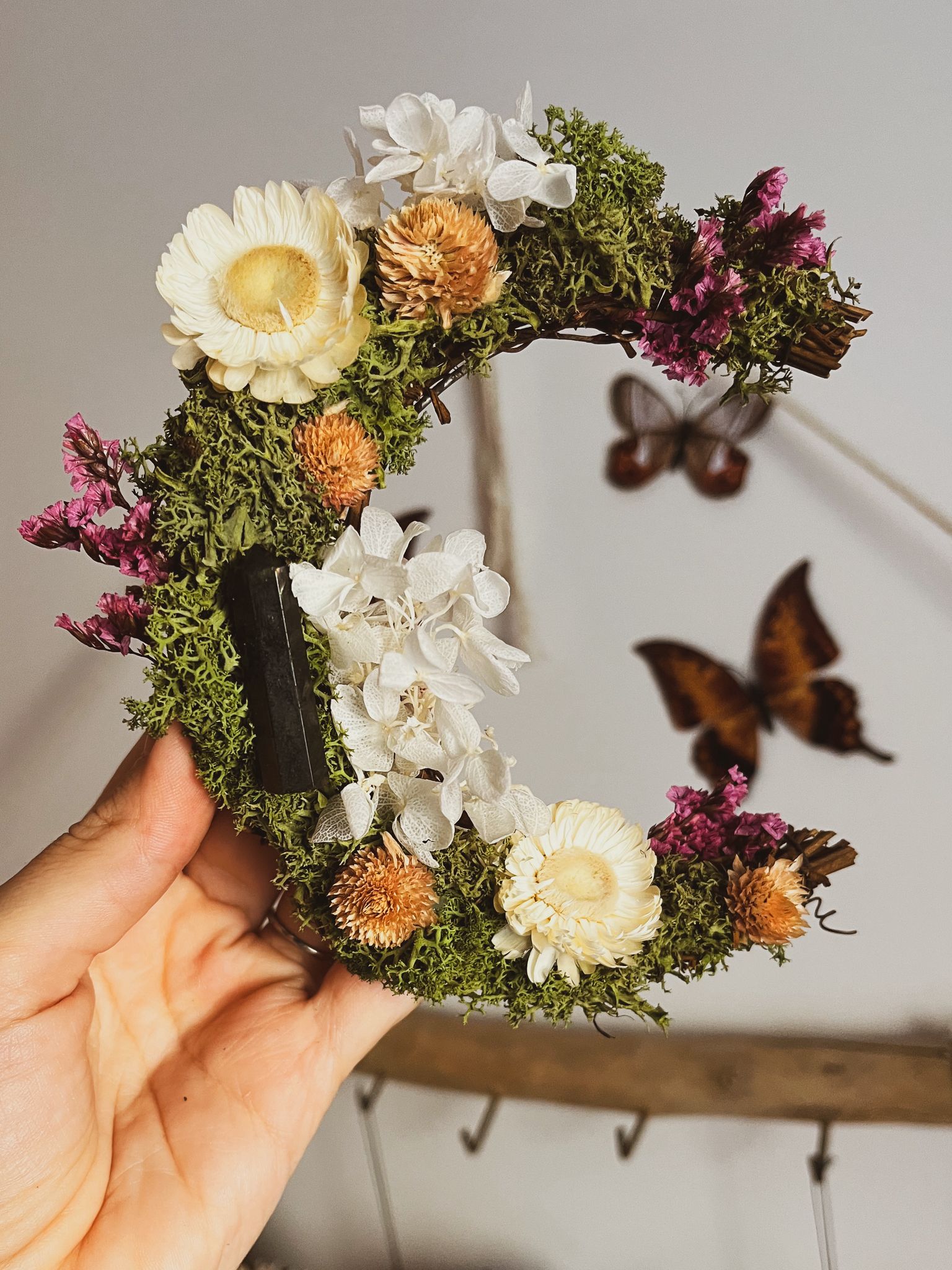 He creado cada una de estas coronas con flores preservadas y minerales cuidadosamente elegidos, con la intención de que sean algo más que una pieza decorativa.