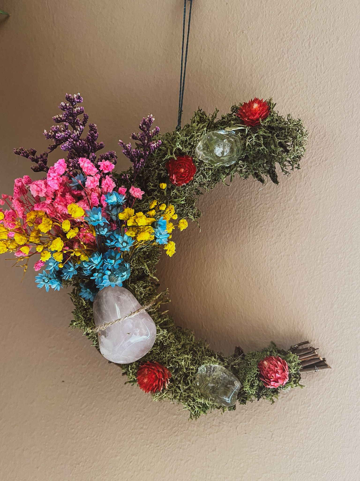 He creado cada una de estas coronas con flores preservadas y minerales cuidadosamente elegidos, con la intención de que sean algo más que una pieza decorativa.