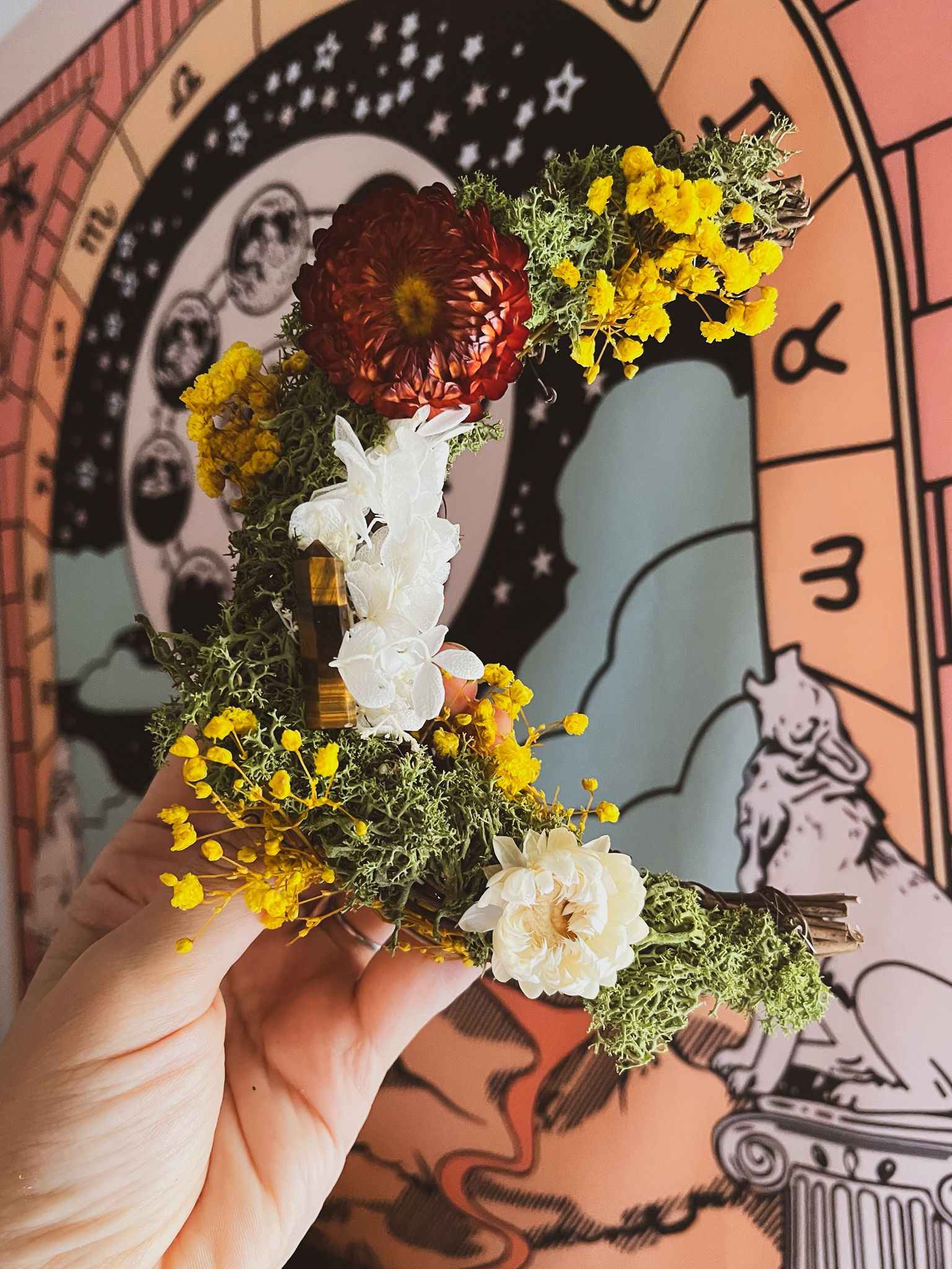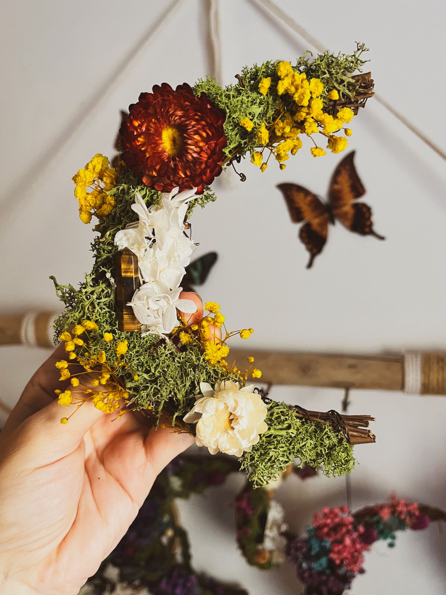 He creado cada una de estas coronas con flores preservadas y minerales cuidadosamente elegidos, con la intención de que sean algo más que una pieza decorativa.