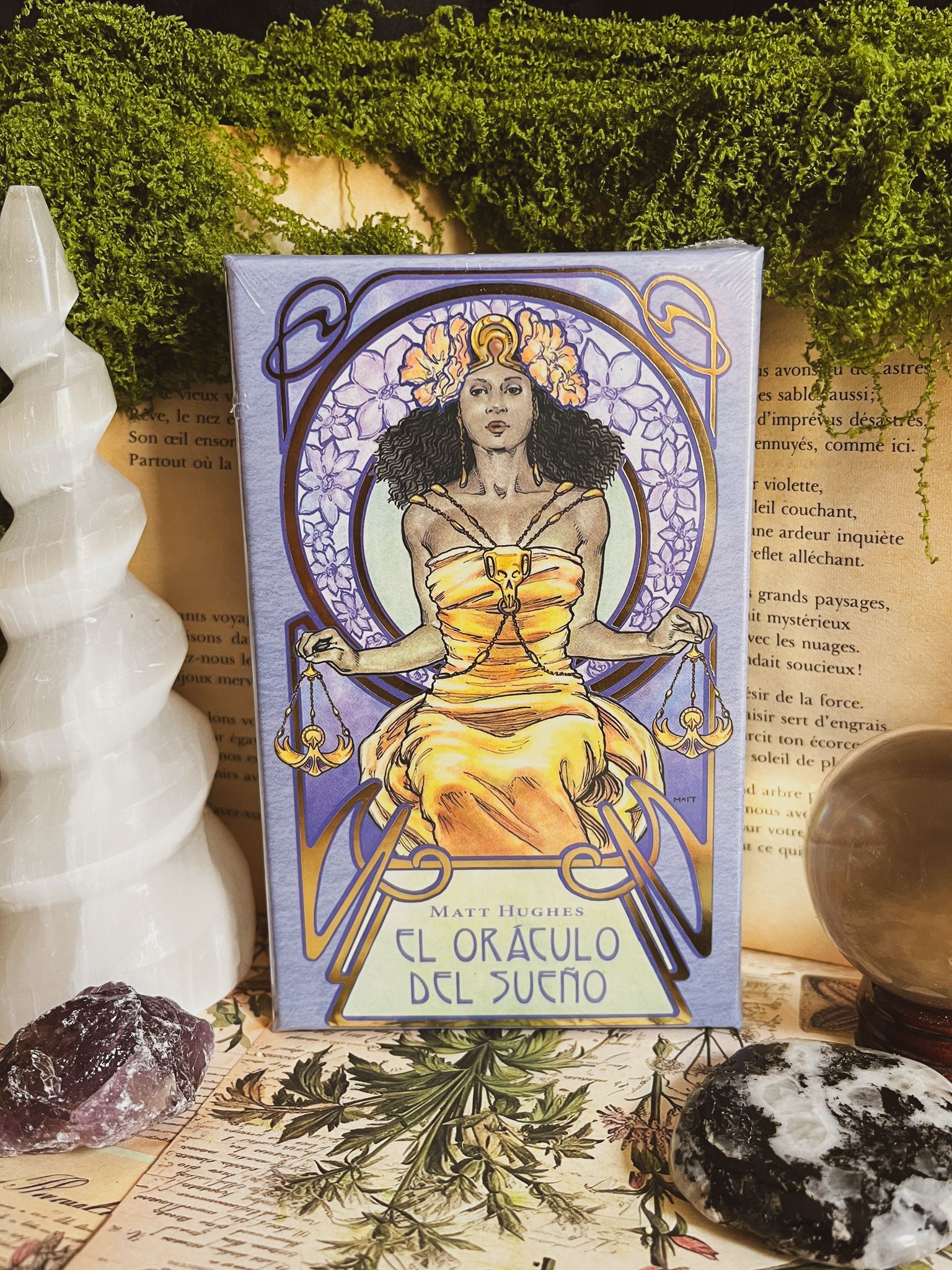 Los sueños son portales naturales hacia otro reino de la conciencia donde vemos lo invisible y comprendemos lo incomprensible. No estamos solos en ese otro mundo, tenemos guías que nos ayudan a comprender las visiones que son desveladas mientras soñamos. El Oráculo del Sueño presenta treinta y dos guías, algunos animales mensajeros, algunos arquetipos mitológicos, para ayudarnos a explorar los espacios liminares de nuestras vidas. Esta baraja de adivinación exhibe detalles resaltados en pan de oro. El manual nos ayuda a interpretar los mensajes que recibidos de lo más elevado de nosotros. El Oráculo del Sueño puede utilizarse como una baraja de adivinación independiente o junto al tarot de las Visiones Etéreas.