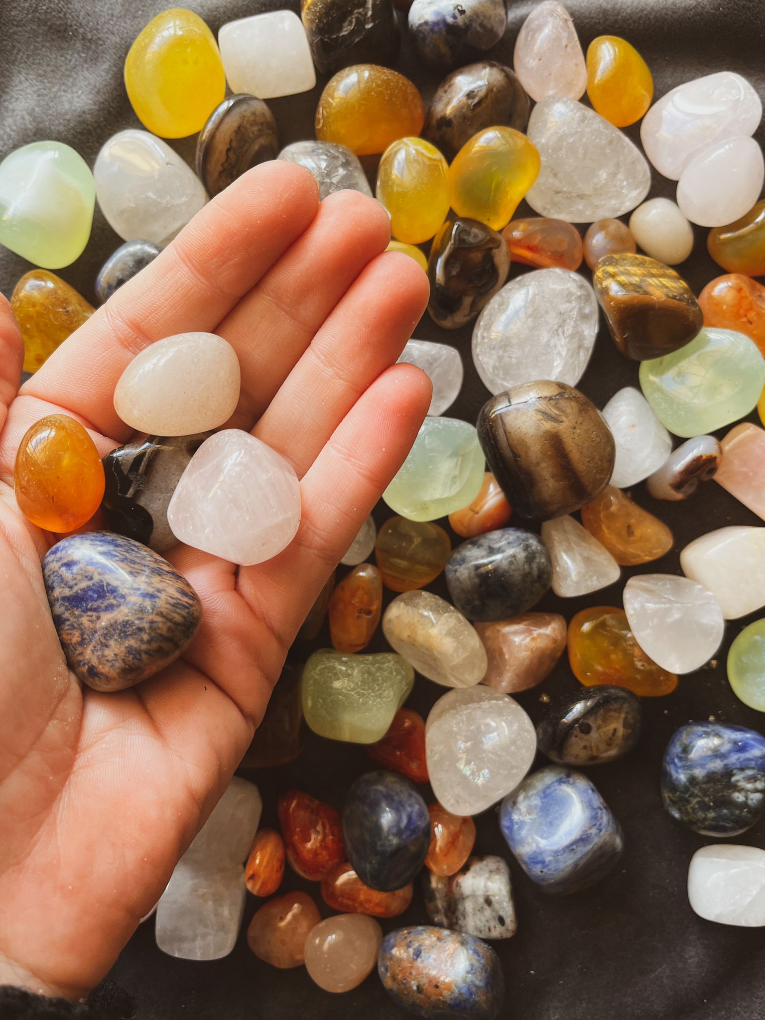 Hay: ojo de tigre, cuarzo rosa, cuarzo cristal, sodalita, onix amarillo, onix negro y carneola